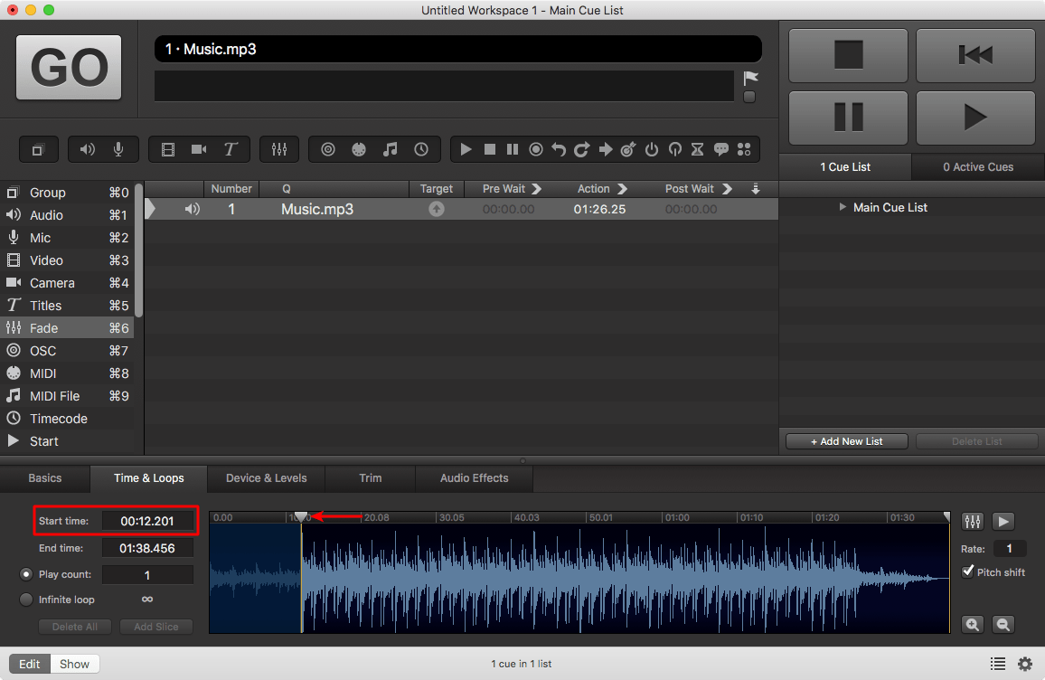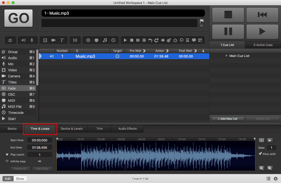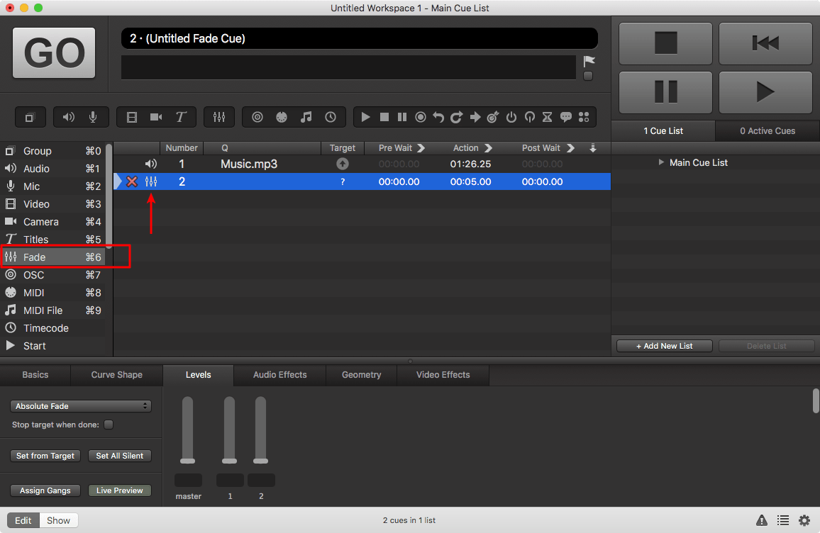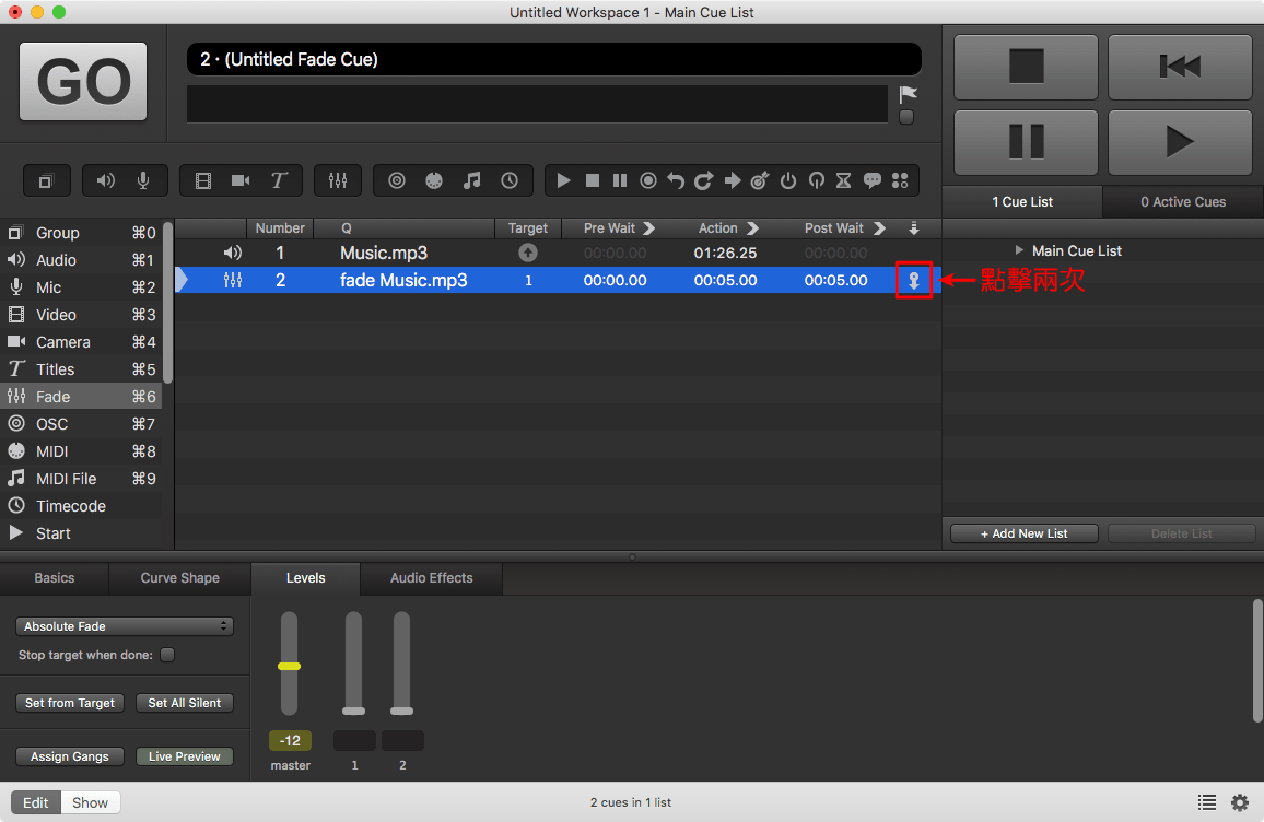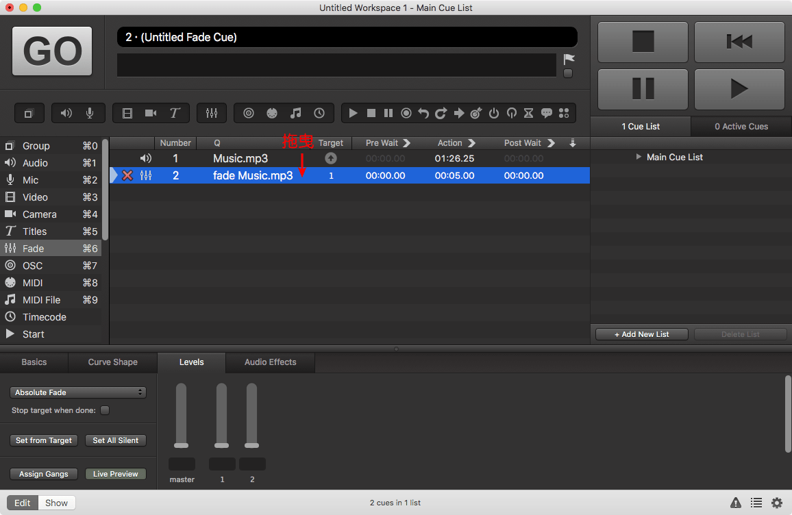 ▼這個其實是開場及背景音樂,我不用把全段音樂播完進行之後的內容,所以我在這裡加入一個Fade Cue,請在左邊的Toolbox選”Fade”,或者鍵盤按”Command + 6″,即可加入一個空白的Fade Cue